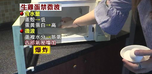 最近有网友拍实验影片,将水煮蛋微波后,拿叉子轻轻戳,没想到水煮蛋瞬间大爆炸变成蛋花。而生鸡蛋微波也一样,原来是因为蛋壳含水量极少,但蛋黄蛋白含水量高。微波时,蛋里的水分变成蒸气,加上被不透气的蛋壳裹住,内部气压增加,鸡蛋就容易爆炸。其实很多食物都要避免微波,包含水果、塑胶餐盒、金属制品等等,都要特别注意。