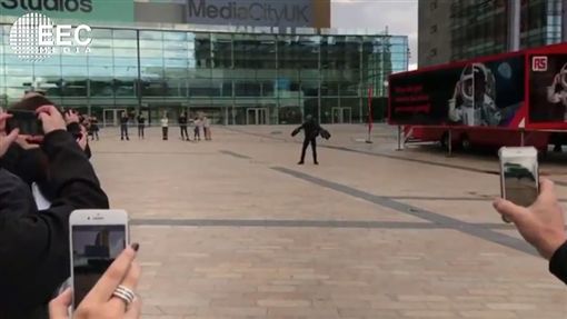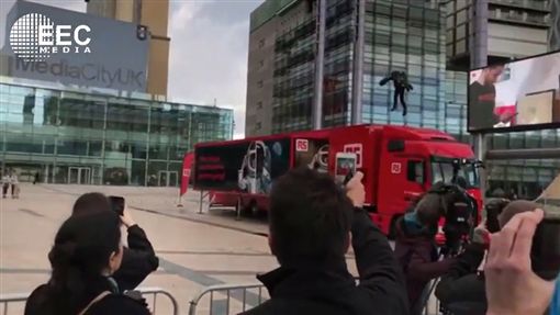 飞天遁地、来去自如,想像钢铁人一样这么自由,不再是电影才有的情节。有影片有真相,穿上这套特殊装备就可以有如钢铁人一般腾空飞行,38岁的英国发明家布朗宁现身曼彻斯特的媒体城,当众飞越一辆红色货柜车,最后安稳落地。