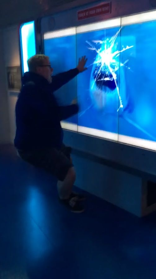 美国一名男子格雷戈里(Gregory Heinzman),日前触摸了国际间谍博物馆一面写著「后果自负」的玻璃,结果下一秒竟有一只鲨鱼朝玻璃猛冲,将玻璃撞得粉碎,格雷戈里也被吓到倒在地上,以为自己「小命不保」,事后才发现原来只是影片。
