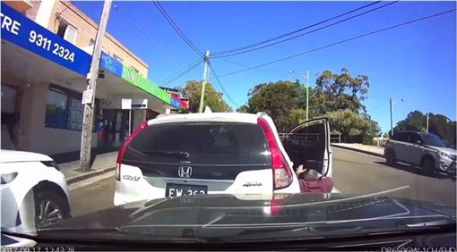 网友昨日在脸书粉专Dash Cam Owners Australia上传这段影片,影片中前方轿车突然剎车,驾驶按下喇叭后,却引来对方不满,用力推开门准备下车理论,没想到车子却突然往后滑,恰巧把他撞倒在地,爬起来还继续骂个不停,让后方驾驶看傻了眼!