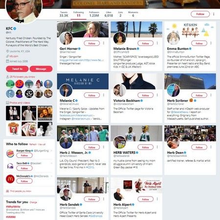 报导指出,肯德基帐号追踪的人分别是5个英国女子团体「辣妹合唱团」(Spice Girls)的前团员,以及6个名字里有「哈伯」(Herb)的人。原来这是肯德基的美国电子行销经理麦可班特森(Bentley McBentleson)在9月初埋下彩蛋,并表示「还以为没人会发现呢。」